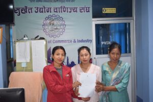 राष्ट्रिय युवा परिषदको आयोजनामा सञ्चालन हुन गइरहेको “युवाबाट उत्पादित सूचना प्रविधि तथा स्टार्टअप व्यवसाय प्रदर्शनी” मा सहभागिता जनाउनका लागि पातालगंगा हस्तकला सामग्री उद्यमी समूह उद्योगकी सदस्य श्री निर्मला चौधरी सुर्खेत उद्योग वाणिज्य संघद्वारा स्थापना गरिएको SME हेल्पडेस्क